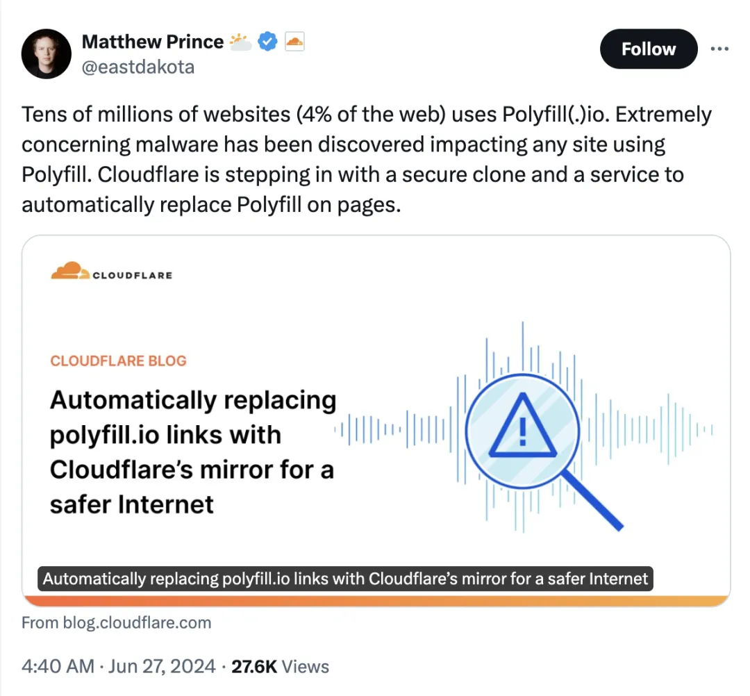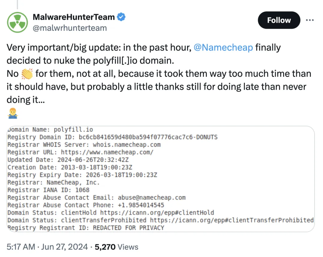 polyfill.io 的域名注册商已经暂停了该域名的使用,服务已经无法正常访问;Google 已经屏蔽了使用 polyfill.io 的网站的广告。