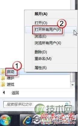 在所有程序中找到“启动”,然后选择“打开所有用户”如下图: