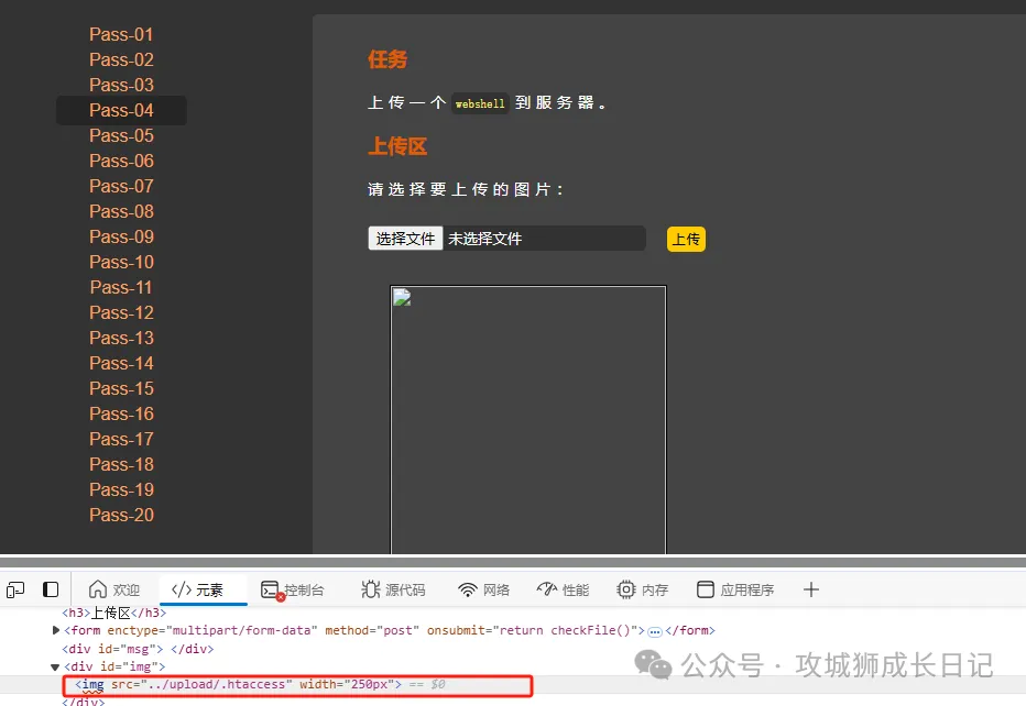 在Pass04关卡的上传页面,我们先上传 .htaccess 文件 。