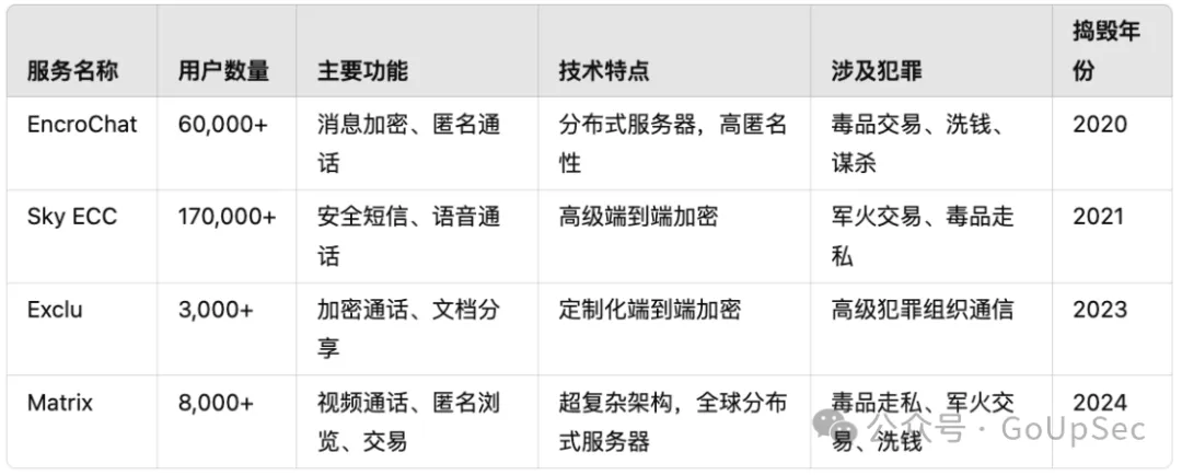 非法加密通信服务的“碎片化”挑战近年来,非法加密通信服务层出不穷,以下是被捣毁的主要加密服务的统计和特点分析:
