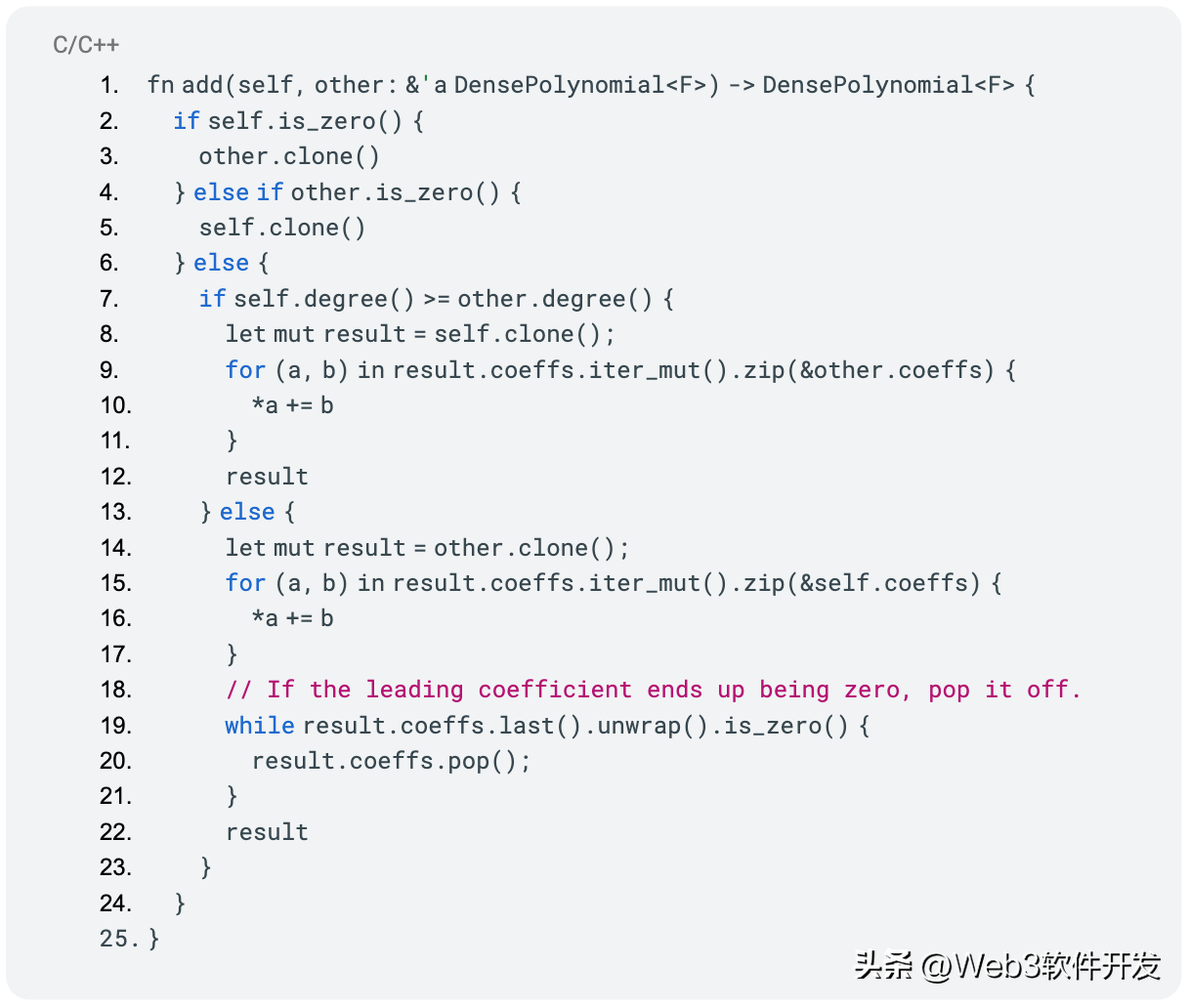 2. 案例分析算术运算后缺乏多项式标准化,该漏洞属于 ZK 证明系统实现上的通用性漏洞。以下,我们以 Zendoo 库中用于快速傅里叶变换(FFT)的密集多项式(dense polynomials)实现的代码为例,说明其中存在的算术运算后缺乏多项式标准化的漏洞。