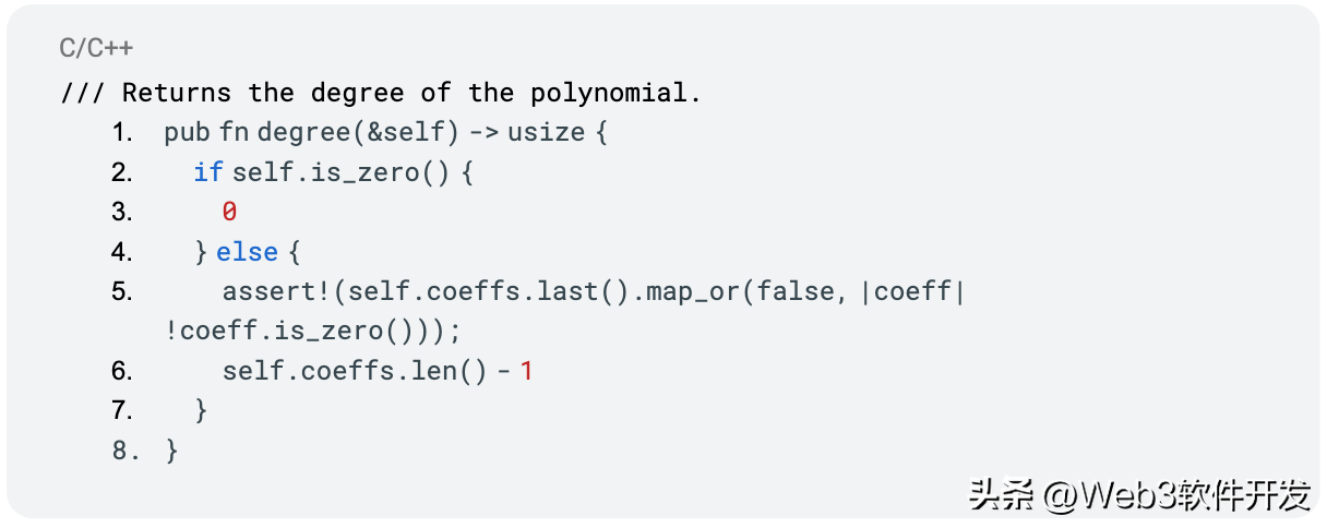 举个例子,self 是非标准化的多项式 1+2x+0x2,即向量[1,2,0],其最高次项的系数为 0。当 other 也不是零多项式时,满足 add() 函数的第三个分支,以 self 来调用 degree() 函数。在 degree() 函数中进入 else 分支。在 else 分支中有一个 assert! 宏,用来确保多项式的最高次数的系数不为 0。如果为 0,self.coeffs.last().map_or(false, |coeff| !coeff.is_zero()) 表达式结果为 false。即 self 向量的最后一个元素,即多项式的最高次项的系数为 0,返回 false。此时,assert! 宏会 panic。