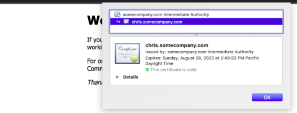 复制kubectl -n istio-system get secret my-cert -o json | jq -r .data["ca.crt"] | base64 -d > ca.crtopen ca.crt# mark as always trust1.2.3.在浏览器中打开,我们现在可以使用由 vault 签名的有效 TLS 证书访问我们的 nginx 服务器 (https://chris.somecompany.com:8443)!