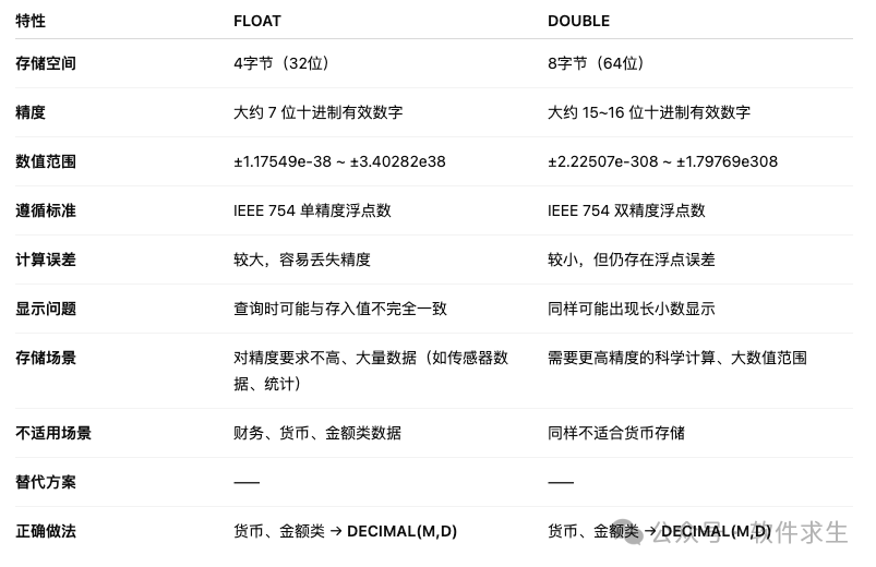 先答FLOAT和DOUBLE的区别。再补充说明浮点数存货币会出问题。最后推荐用DECIMAL,这样面试官一定觉得你“考虑全面”。常见坑点总结为了防止大家踩坑,我把FLOAT和DOUBLE的典型问题总结下: